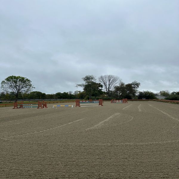 Our outdoor arena is 110'x220'. Its sand footing is well suited for jumping or dressage lessons. The arena is well drained and useable for lessons within hours even after the heaviest of rains..