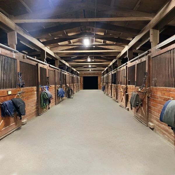 We have 32 stalls, 3 dedicated cross-tie stalls, wash stall with hot water, climate controlled tack room, laundry, feed room, storage closet and the lounge.